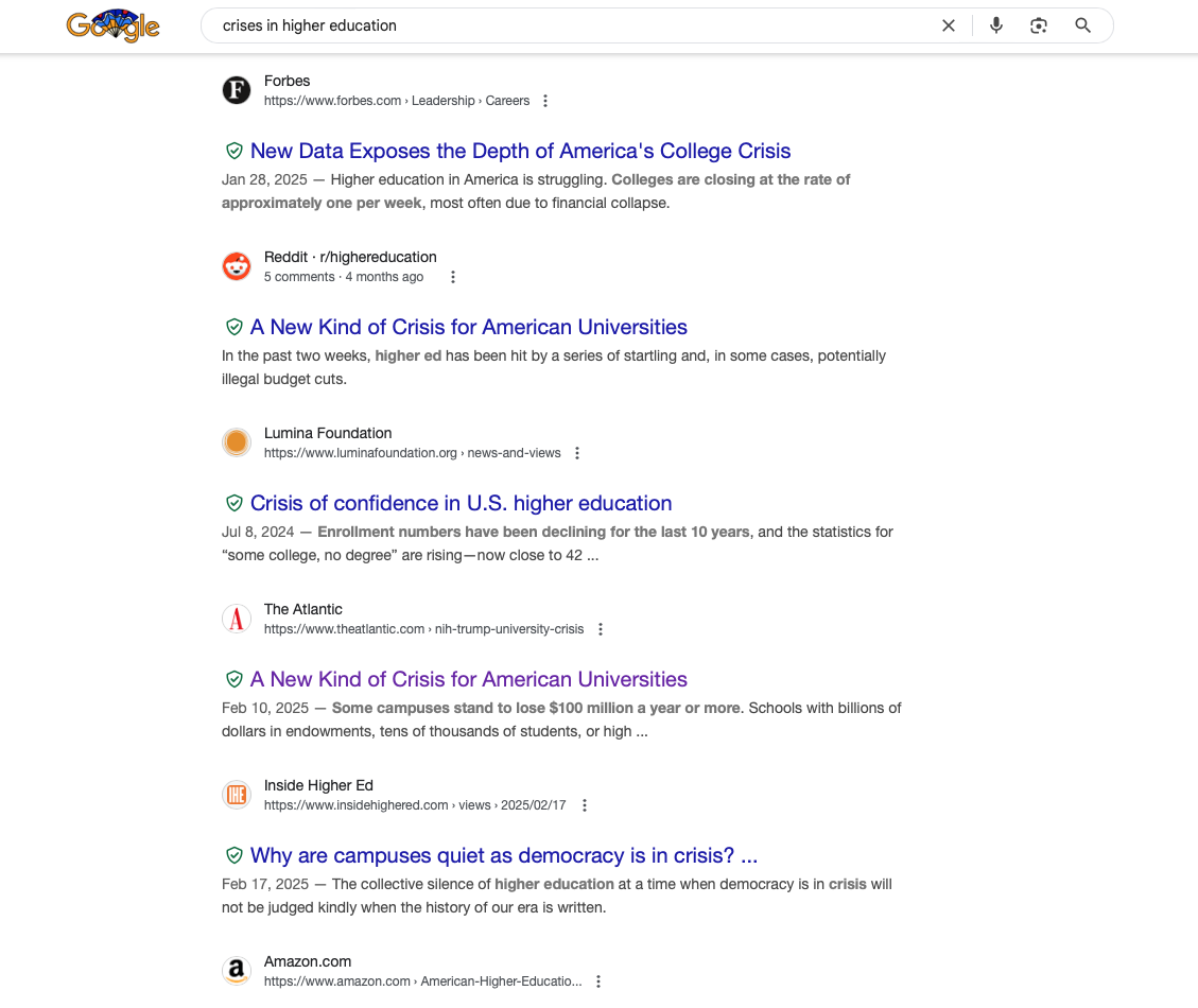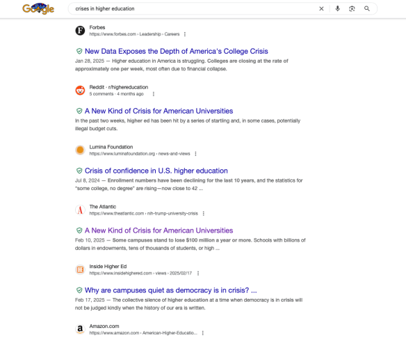 A web search on the crises in higher education will net you with an abundance of current difficulties. But I ask, Is it possible that some of the crisis stems from our own sense of personal crisis?